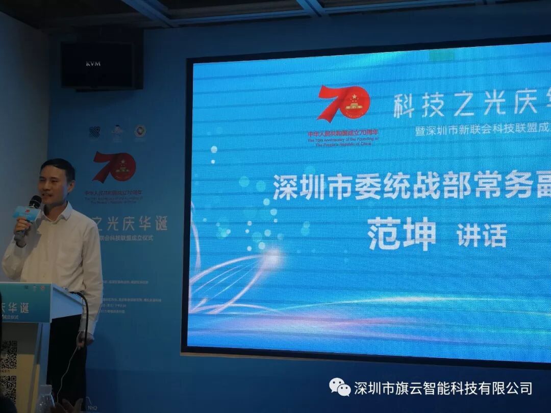 2019年9月20号,在深圳市委统战部、福田区委统战部、福田区科创局、市新联会等单位的指导下,发起的深圳市新联会科技联盟,旗云智能作为首批联盟发起企业为深圳建设中国特色社会主义先行示范区贡献力量。在这庆祝中华人民共和国成立70周年之际,成立科技联盟是一件很让人为之振奋的事。